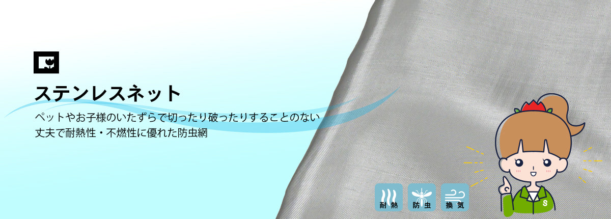 丈夫で耐久性のある「ステンレスネット」は、ご自宅でうっかりタバコの火が付いても燃える心配がない、耐熱性・不燃性も兼ね備えた頑丈な防虫網になります。台所など火を取り扱う場所での使用も、燃える心配がないので安心です。燃えにくく破けにくいので犯罪抑止にもつながります。