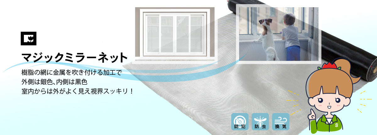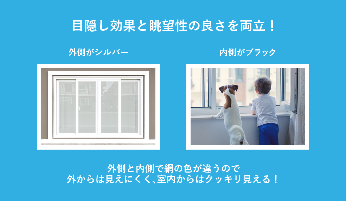 アミド屋の目隠し効果のある「マジックミラーネット」は、スパッタリング加工(樹脂の網に金属を吹き付ける加工)により外側は銀色、内側は黒色となっております。室内からは外がよく見え視界スッキリ!