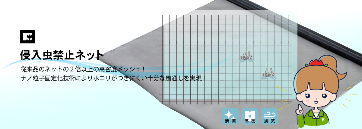従来品のネットの2倍以上の高密度メッシュです。さらに、ナノ粒子固定化技術によりホコリがつきにくく、十分な風通しを得られます。
