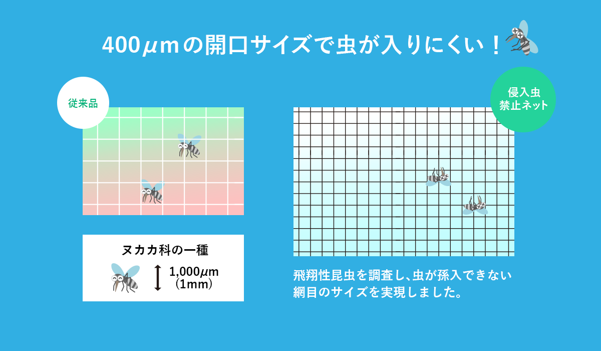 高密度メッシュ400μm開口サイズで細かな虫もシャットアウト!