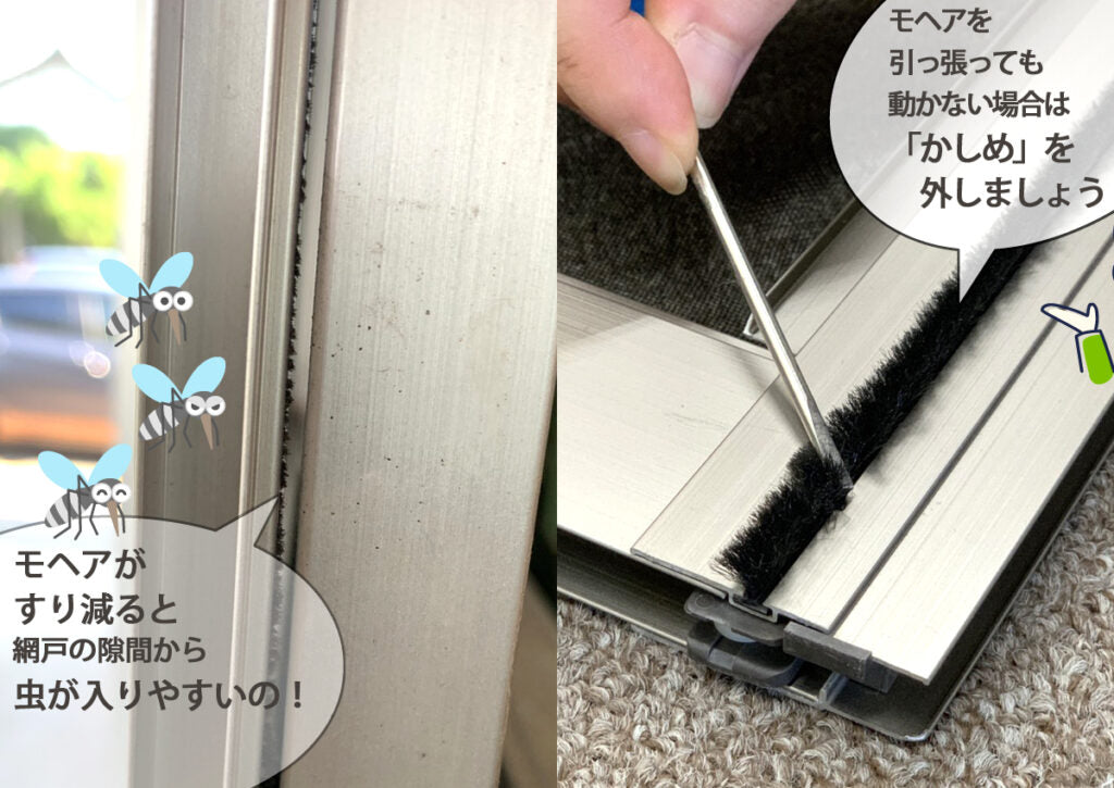 でも、網戸のモヘアは網戸に取り付けられている網戸と網戸の隙間から虫の侵入を防ぐ大切な部材なのです。
