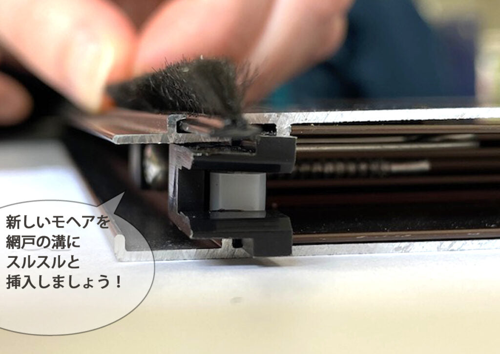 新しいモヘアを網戸の溝にスルスルと挿入します。