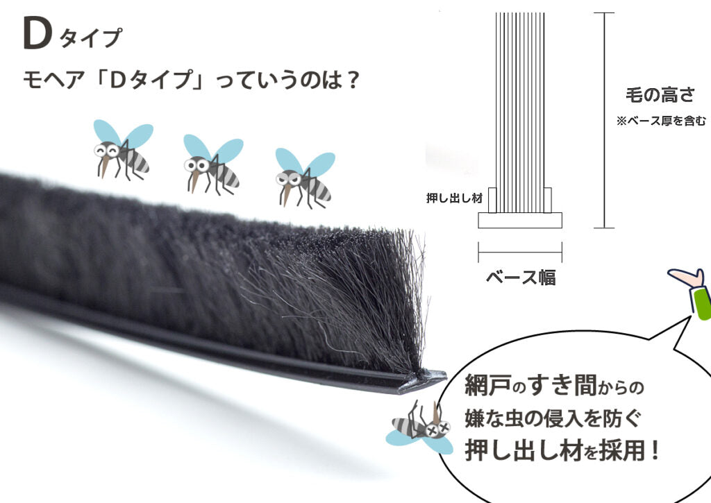 網戸の隙間からの虫の侵入を防ぐ押し出し材を採用。日本国内で使用されている網戸専用モヘアの大半は「汎用タイプ」モヘアですが、三恵ネットの網戸専用モヘア「Dタイプ」は、汎用タイプの弱点を解消したモヘア。ベース部分に押し出し材を採用し、網戸の隙間からの虫の侵入を防ぎ、網戸専用モヘアの長期使用の安定した品質、優れた防虫対策・侵入防止対策に効果を発揮するモヘアです。