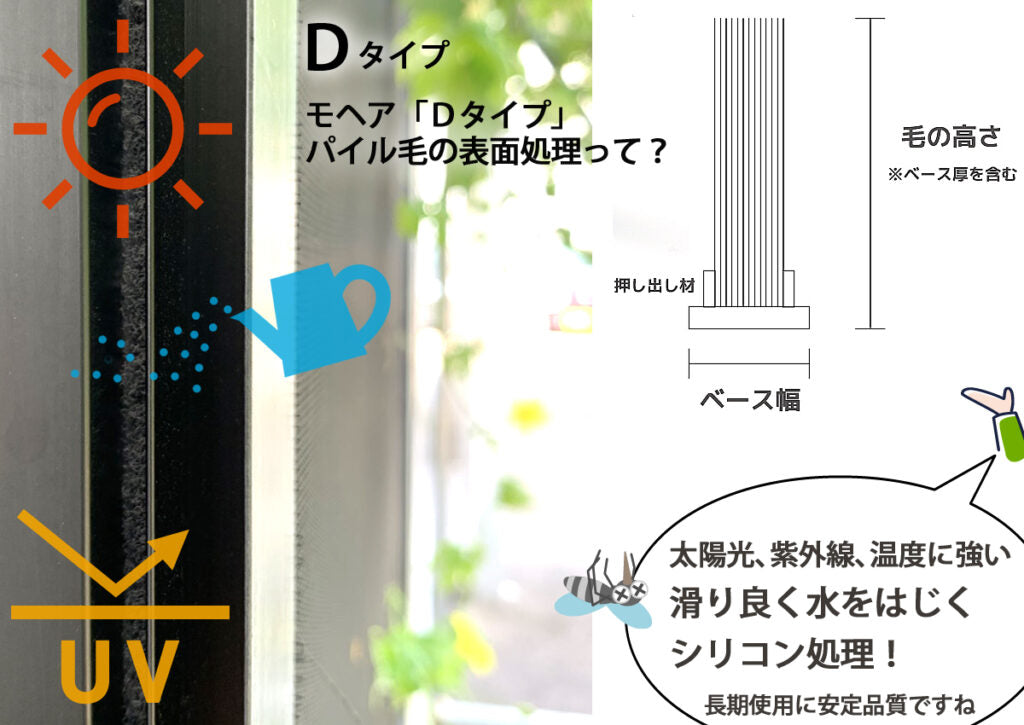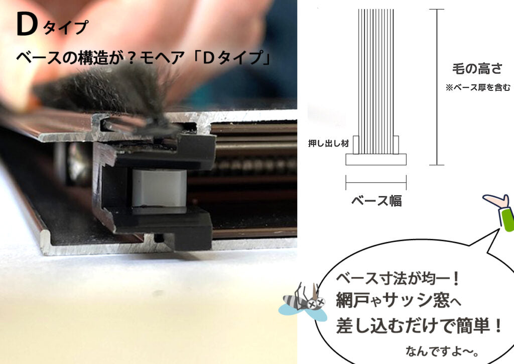 ベース寸法が均一で網戸・サッシ窓への挿入が容易。アミド屋の網戸専用モヘア「Dタイプ」は押し出し成形した差込み部分(ベース)にパイル(毛)を超音波で溶着した製品です。押し出し材で有るため、ベース寸法が均一であり網戸やサッシ窓の形材等への挿入が容易で、侵入する虫から網戸の脇をしっかりガードする網戸専用モヘアです。